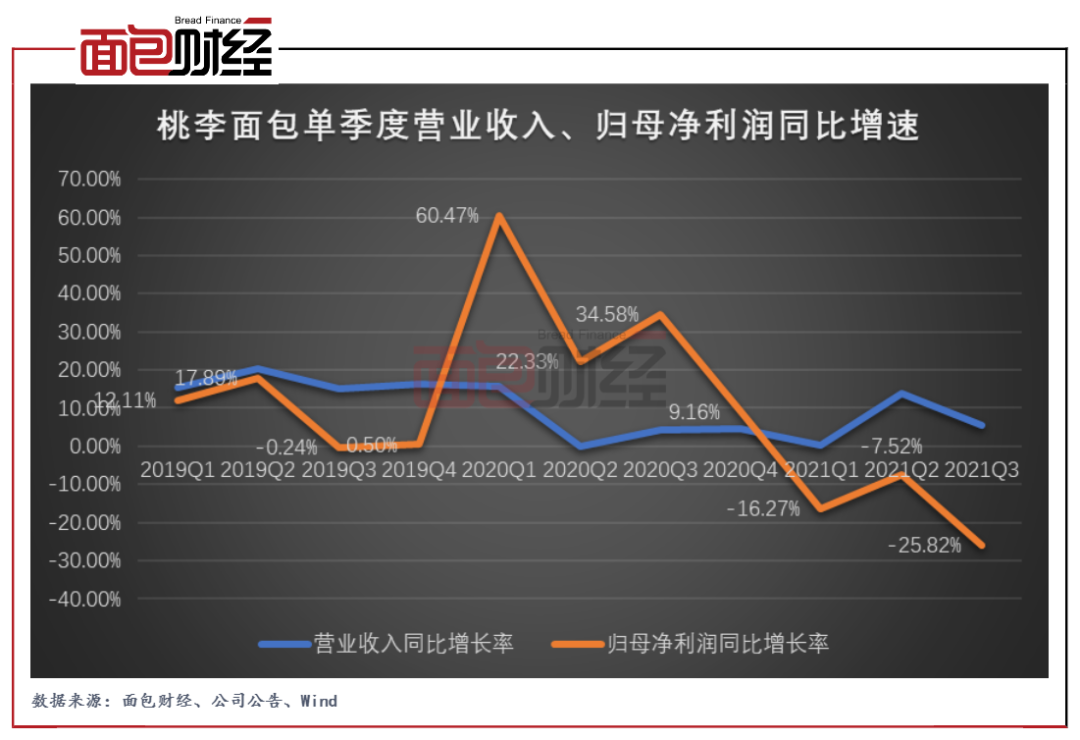 进入2021年以来,桃李面包的归母净利润出现持续下滑,第一季度、第二季度分别同比下降16.27%和7.52%。最新披露的第三季度业绩显示,公司归母净利润增速进一步下降至-25.82%。