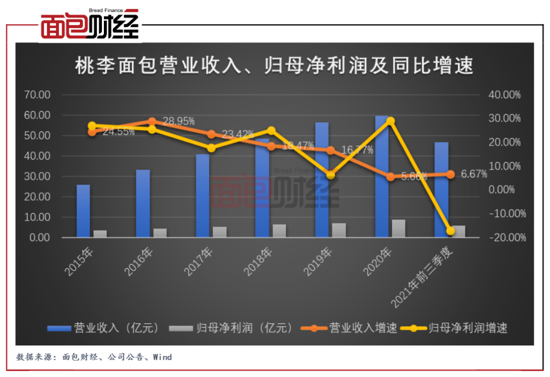 图2:2015年至2021年前三季度桃李面包营业收入、归母净利润及同比增速