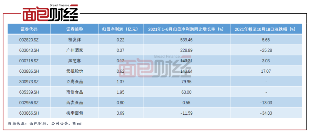 在属于申万烘焙食品行业分类的8家公司中,桃李面包是第一家披露三季报的企业。对比这些企业今年上半年的业绩表现,桃李面包的归母净利润增速排名垫底。