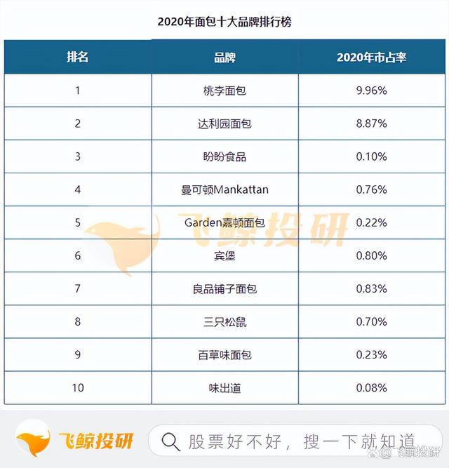 虽然桃李面包是行业龙头,可如今的短保面包市场竞争非常激烈,预计将会是一场硬仗。2019年,桃李面包的市场份额占整个面包行业的10.5%,2020年市占率下降到9.96%,与行业第二达利园(8.87%)的差距并不大。