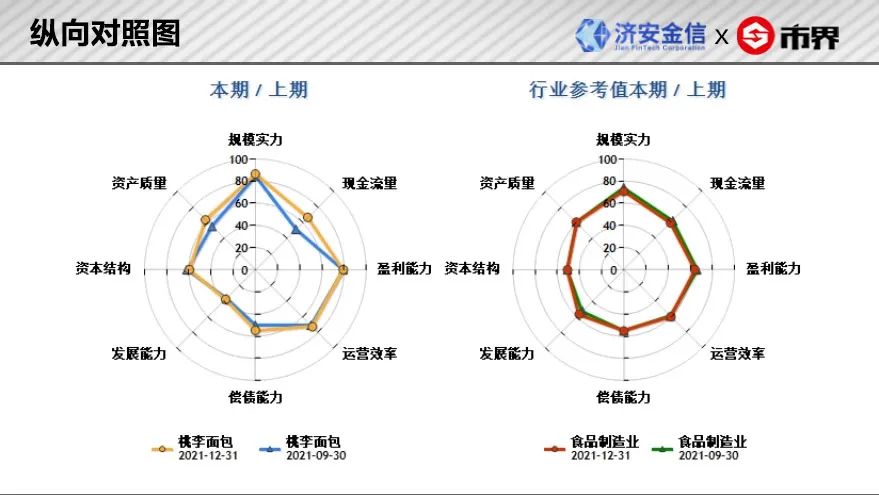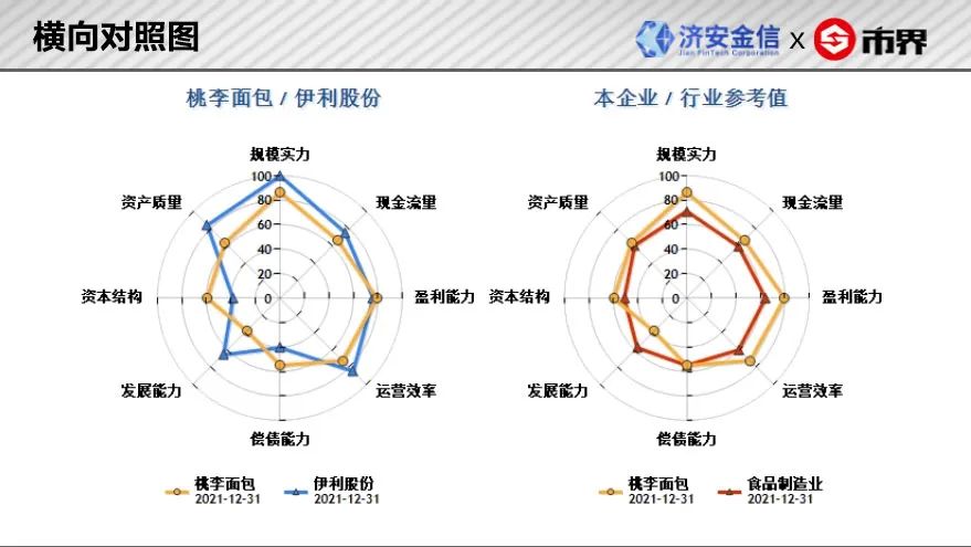 左图是上市公司桃李面包与本行业龙头公司伊利股份(600887)在2021年四季度财务结构之间的比照;