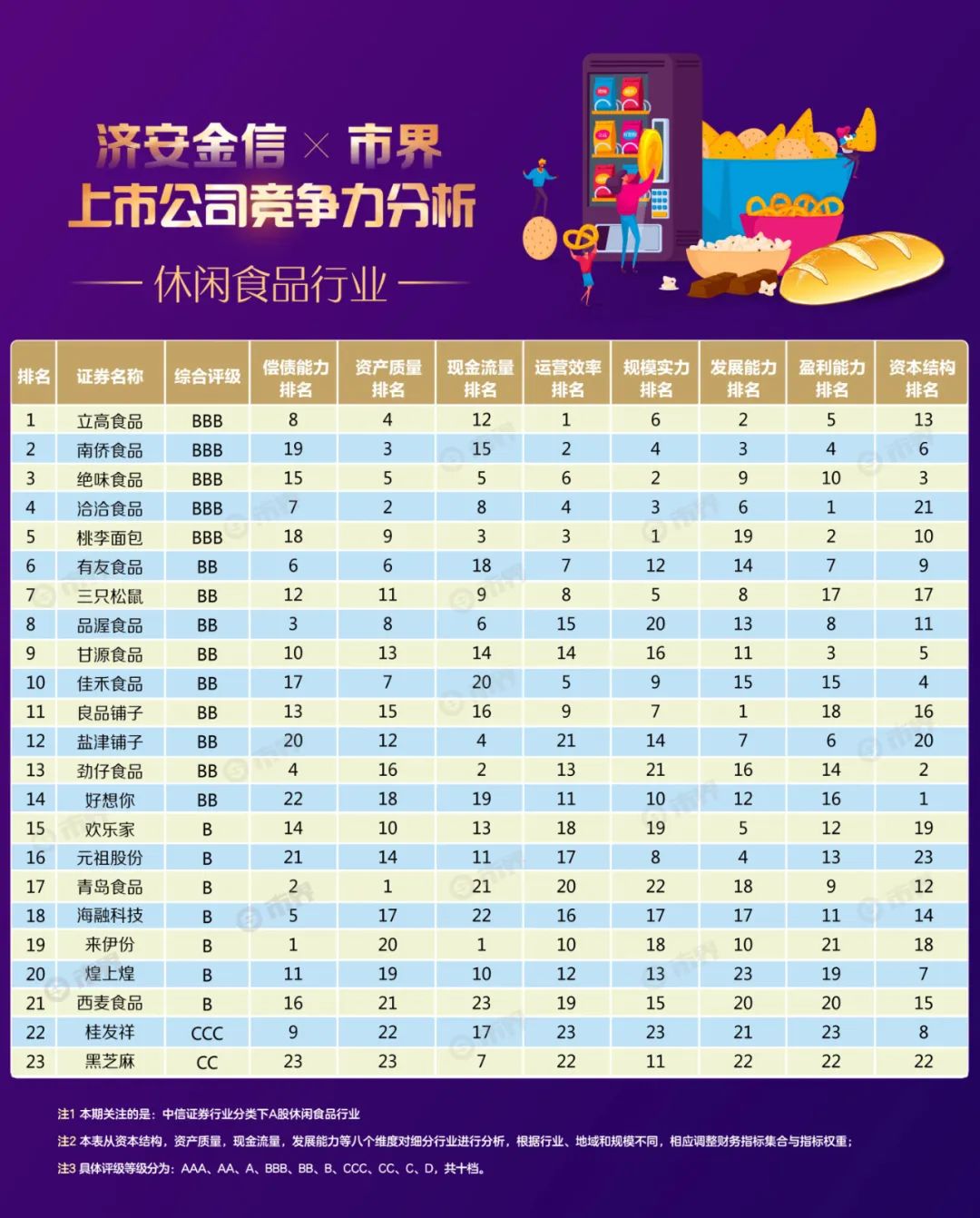 以下是A股休闲食品行业23家公司(中信证券行业分类)竞争力分析情况。
