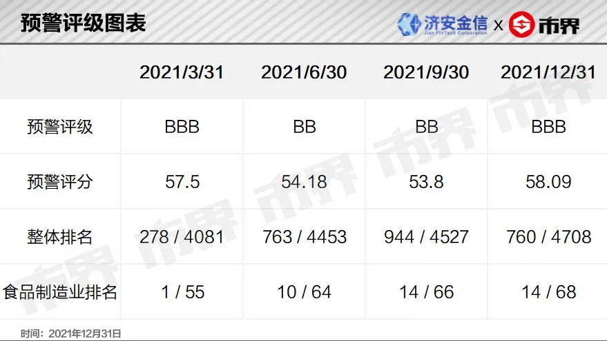 2021年四季度桃李面包预警评级从BB上升至BBB。当期桃李面包的能力短板分别是发展能力、偿债能力、资本结构。