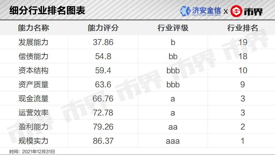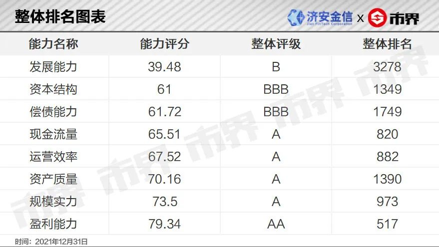 市界联合国内专注于证券与基金行业研究的第三方评价机构济安金信共同推出《上市公司竞争力分析》栏目,通过自研评价体系,从资本结构,资产质量,现金流量,发展能力等八个维度(基于行业、地域和规模不同,相应调整财务指标集合与指标权重)对各细分行业内所有上市公司进行多维度体检、评级;并对若干公司具体分析,形成报告。