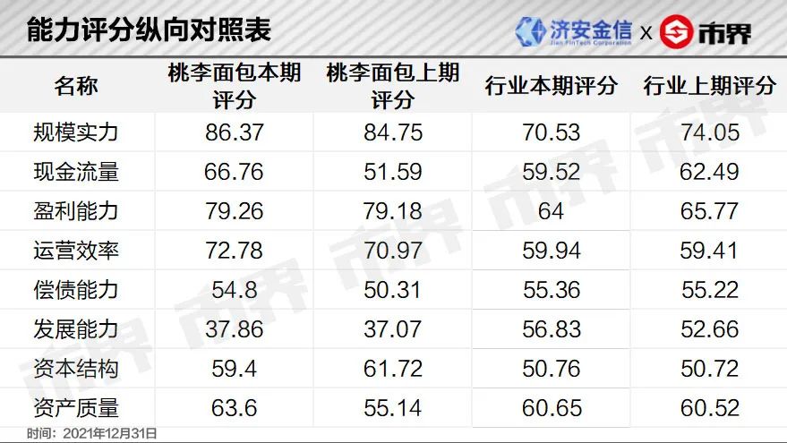 1)桃李面包发展能力整体评级B,表示业绩增长率与资本规模扩张速度处于A股市场上市公司平均水平,持续发展能力一般,在全市场4708家公司中排名第3278。