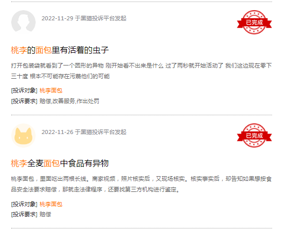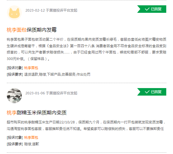 记者从新浪旗下的“黑猫服务”中搜索“桃李面包”,可以查询到的投诉有284条,其中不少投诉原因为面包变质、发霉、有异物等。