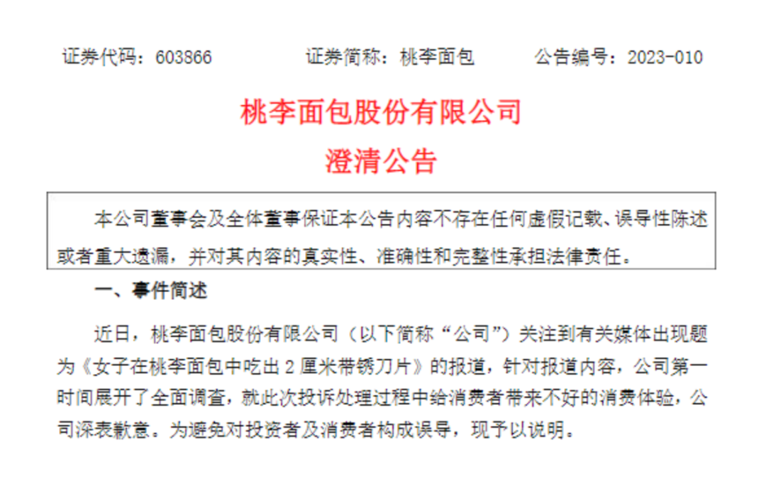 桃李面包在公告中表示,自公司成立以来,一直视食品质量安全为首要任务,公司建立了完整的生产质量安全过程监控体系,并对各生产过程及关键控制点进行监控。公司严格按照ISO22000食品安全体系的要求分别对原材料、生产、仓储等过程进行危害分析,确定关键控制点、关键限值并进行监控和验证,保证食品安全。