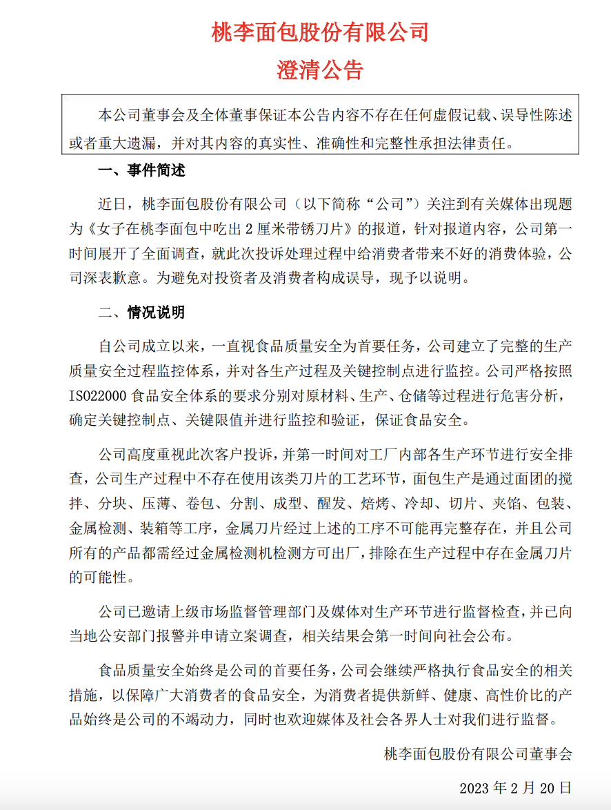 “近日,公司关注到有关媒体出现题为《女子在桃李面包中吃出2厘米带锈刀片》的报道,针对报道内容,公司第一时间展开了全面调查,就此次投诉处理过程中给消费者带来不好的消费体验,公司深表歉意。”在说明的开篇,桃李面包方面态度颇为诚恳。