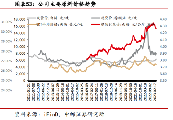目前面粉价格仍维持高位,棕榈油和黄油价格在2022年2季度达到了高点1.6万元和0.67万元,目前回落至0.8万元和0.45万元,仍在相对高位。券商预计白糖价格2023年仍将维持高位。短期内毛利率能否回升,具有诸多不确定性。