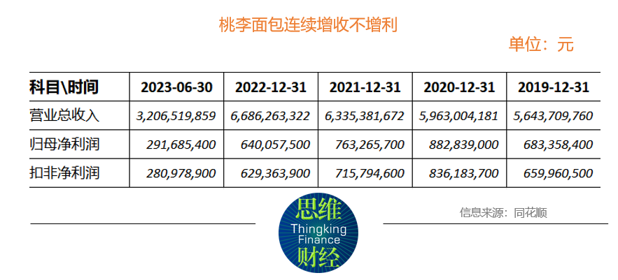2021年、2022年桃李面包营收分别上涨6.24%、5.54%,对应归母净利润下滑13.54%、16.14%,结合今年上半年的业绩,不难看出,桃李面包持续两年多增收不增利,且收入增速放缓。
