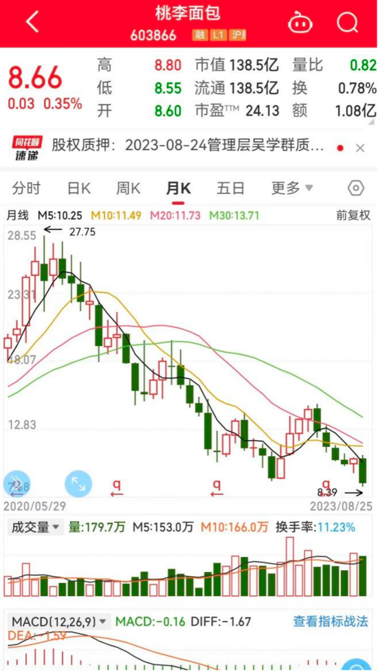 在中报业绩下滑后,桃李面包又曝出了实控人部分持股被司法冻结的利空,股价23日应声跌停。