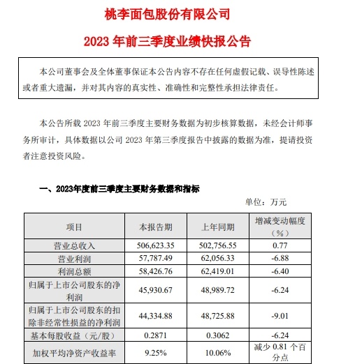 10月12日,桃李面包(603866)发布2023年前三季度业绩快报。报告期内,公司实现营业收入50.7亿元,同比增长0.77%;营业利润5.78亿元,较上年同期下降6.88%;归属于上市公司股东的净利润4.6亿元,同比下降6.24%。