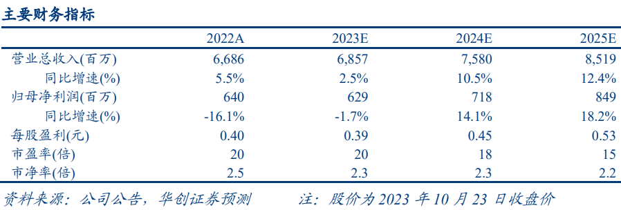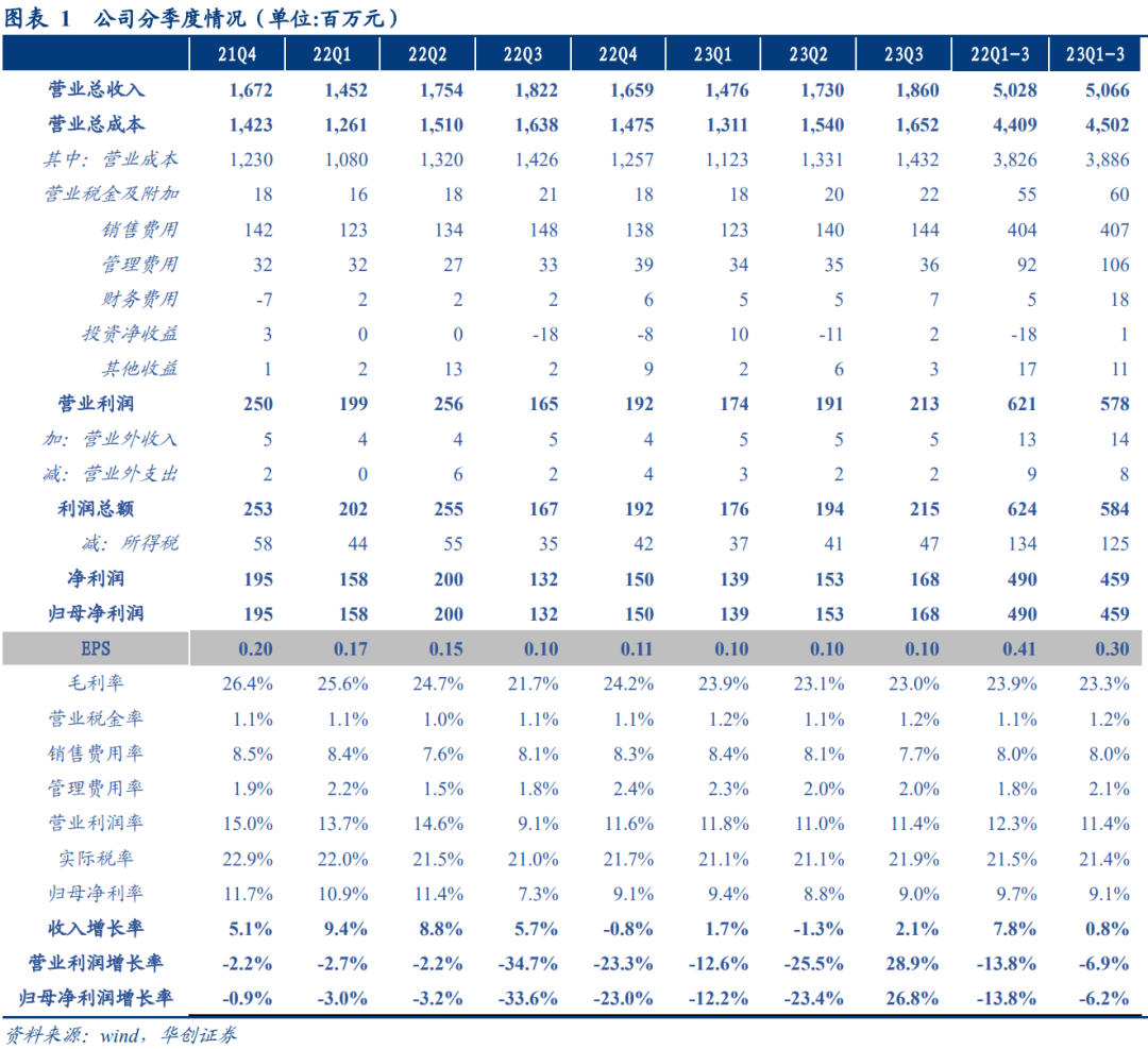 公司发布2023年三季报,2023年Q1-3实现收入50.66亿元,同比+ 0.77%;归母净利润4.59亿元,同比-6.24%;扣非归母净利润4.43亿元,同比-9.01%。单Q3来看,公司实现收入18.60亿元,同比+2.08%;归母净利润1.68亿元,同比+26.81%;扣非归母净利润1.62亿元,同比+11.11%。