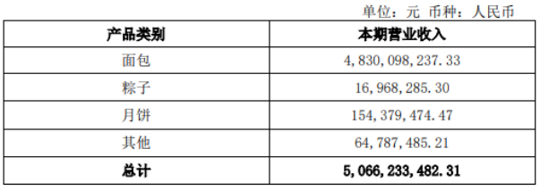 前三季度,公司面包、月饼分别实现营收为48.30亿、1.54亿,营收占比分别为95.34%、3.05%;粽子、其他实现营收分别为1696.83万、6478.75万,营收占比分别为0.33%、1.28%。