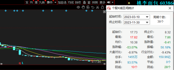 业绩承压的另一面,公司在资本市场的表现也并不乐观。2023年3月10日至今(2023年11月30日)八个月左右的时间里,公司股价下跌53.07%。