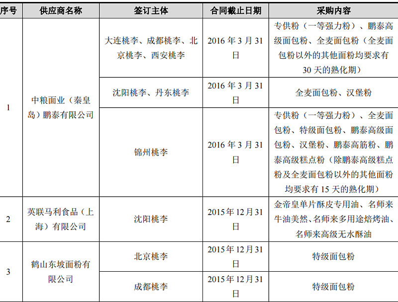 做面包的最主要的原材料是面粉和油脂,对应的供应商主要为中粮面业(秦皇岛)、鹏泰有限公司、英联马利食品有限公司等,原材料供应商授予桃李一定的信用周期,其中面粉供应商的信用周期约为 60 天,油脂类约为 45 天。