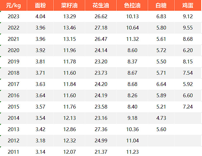 2023年桃李面包的平均采购价——面粉4.79元/kg,油脂11.92元/kg,糖6.32元/kg,鸡蛋9.51元/kg,酵母5.74元/kg(酵母按照19年数据估算)