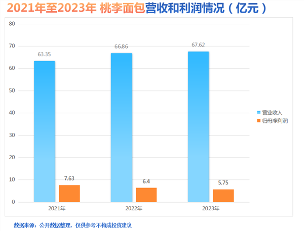 但过往的成功经验并不会永远起效。近年来的桃李面包渐渐触及到了增长天花板。2月1日,“面包第一股”桃李面包(603866.SH)发布了2023年度业绩快报。公告显示,桃李面包2023年营业总收入68亿元,同比微增1%左右;归母净利润不到6亿元,同比下降10%以上。
