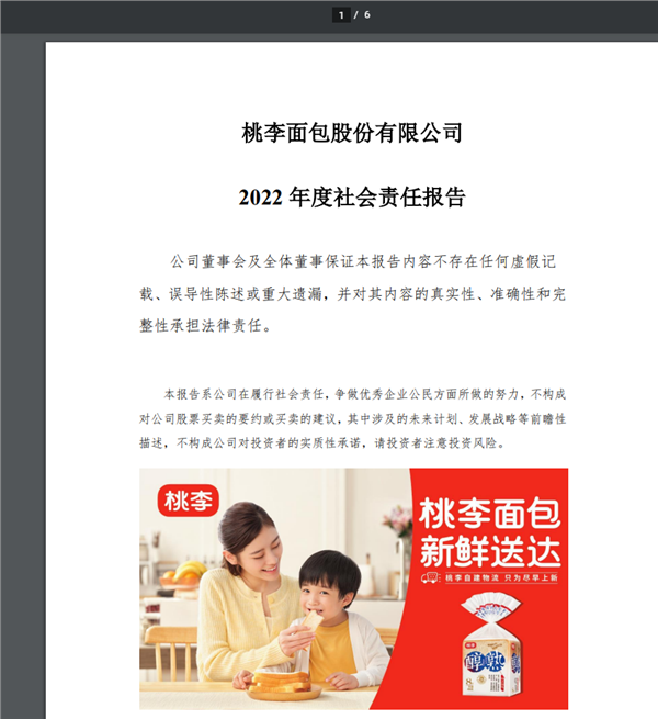 2023年3月,桃李面包发布了2022年度社会责任报告,也是公司首份社会责任报告。