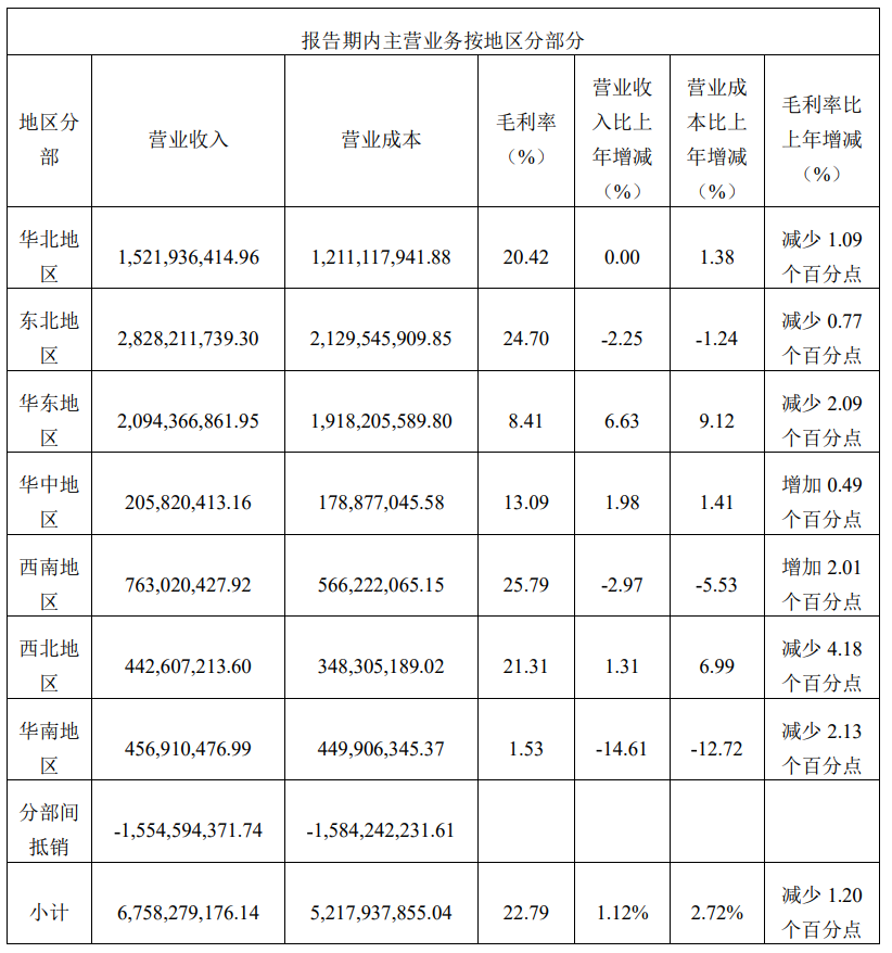 其中华东地区实现营收20.94亿元,同比增长6.63%;华南地区实现营收4.57亿元,同比下降14.61%;此外西南地区和西北地区分别实现收入7.63亿元和4.43亿元,同比分别变动-2.97%、1.31%;华北和华中地区分别实现收入15.22亿元、2.06亿元,同比分别变动0.00%、1.98%。