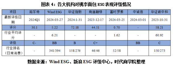 从机构评级情况来看,如图表4所示,截至最新评级日期,多数机构对桃李面包评级为B级或以下。其中,中诚信对其评级为BB级;商道融绿、华证碳中和、路孚特评级分别为C+级、C级、C-级。