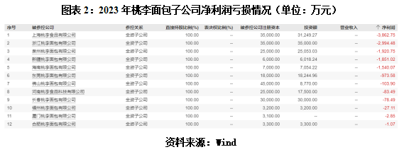 此外,如图表2所示,2023年,桃李面包37家全资子公司中有12家净利润亏损,占比为32.43%。