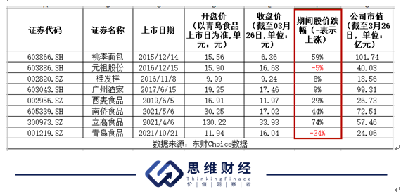 其中,青岛食品于2021年10月21日上市,是迄今为止最后一家烘焙类上市公司。若以青岛食品的上市日期开始,截至3月26日收盘,期间桃李面包、立高食品等六家公司下跌,只有元祖股份、青岛食品上涨,分别上涨5%和34%。