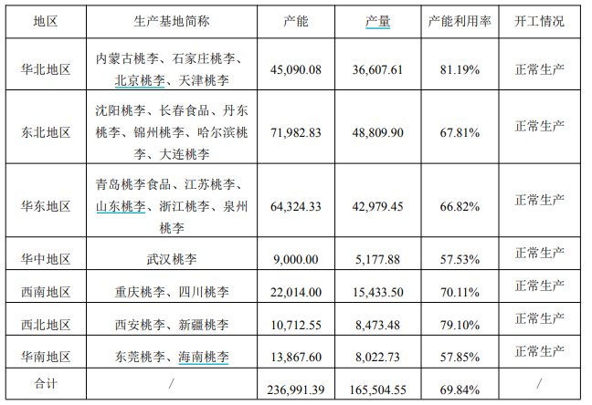 偏弱的市场表现,也导致桃李面包在华中区、华南区的产能利用率不高,分别为57.53%和57.85%,远不及华北区同期的81.19%和西北地区的79.10%。即便是东北区因为新建产能投产和设备更新产能提升拉低了该区的整体产能利用率,但仍达到67.81%。