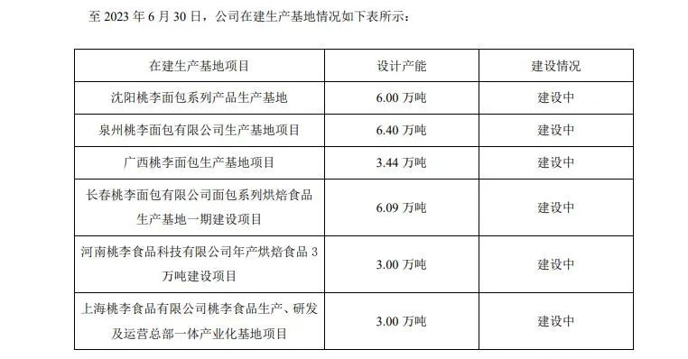 当前,桃李面包仍然有6个扩产项目,分别为设计产能6万吨的“沈阳桃李面包系列产品生产基地”、设计产能6.4万吨的“泉州桃李面包有限公司生产基地项目”、设计产能3.44万吨的“广西桃李面包生产基地项目”、设计产能6.09万吨的“长春桃李面包有限公司面包系列烘焙食品生产基地一期建设项目”、设计产能3万吨的“河南桃李食品科技有限公司年产烘焙食品3万吨建设项目”、设计产能3万吨的“上海桃李食品有限公司桃李食品生产、研发及运营总部一体产业化基地项目”。