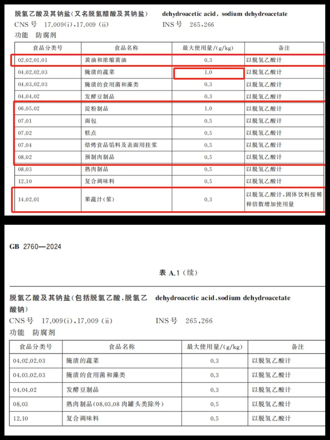 今年3月12日,国家卫健委发布了GB 2760-2024《食品安全国家标准食品添加剂使用标准》,新标准将于2025年2月8日实施。根据新国标,原本12种类别食品中有7种类别被禁止使用脱氢乙酸钠,分别是黄油和浓缩黄油、淀粉制品、面包、糕点、焙烤食品馅料及表面用挂浆、预制肉制品、果蔬汁(浆)这7种类别。此外,“腌渍的蔬菜”中脱氢乙酸钠最大限量由原来的1g/kg减少至0.3g/kg。
