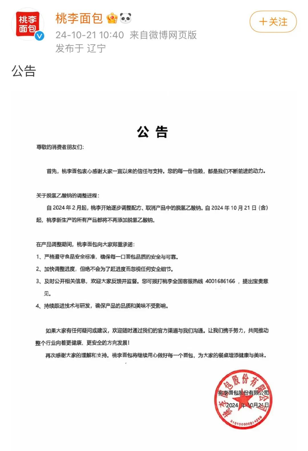 各食品企业纷纷对外回应。10月21日,桃李面包官方发布声明称,自2024年2月起,企业开始调整配方,取消产品中的脱氢乙酸钠,并称自今年10月21日起,企业生产的所有产品都将不再添加脱氢乙酸钠。
