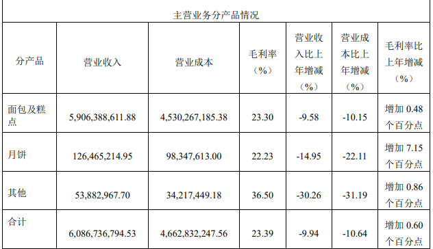 就产品类别来看,各产品的营业收入也有所下滑。其中,核心产品桃李面包及糕点录得营业收入59.06亿元、月饼收入为1.26亿元、其他产品5388.30万元,分别较上年同期下降了9.85%、14.95%和30.26%。