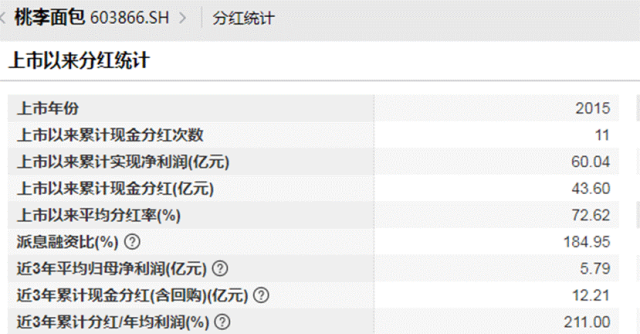 另据数据显示,自2015年上市以来,桃李面包累计净利润60.04亿元,累计现金分红43.6亿元,平均分红率接近73%。