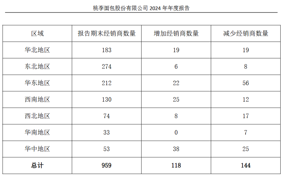 不过,桃李面包南下之路同样折戟。2024年,华北地区、华东地区、华中地区、西南地区以及华南地区营收均在下滑,其中华南地区降幅高达25.79%,且华南地区以33个经销商在7个区域市场中垫底,同时也成为桃李面包2024年唯一一个经销商“0增加”的区域市场。
