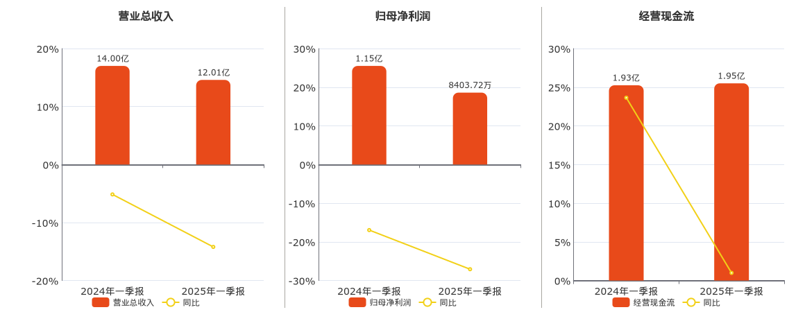 公司营业总收入为12.01亿元,较去年同报告期营业总收入减少1.99亿元,同比较去年同期下降14.20%。归母净利润为8403.72万元,较去年同报告期归母净利润减少3119.37万元,同比较去年同期下降27.07%。经营活动现金净流入为1.95亿元。