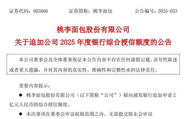 若此次向浦发银行的授信申请成功,桃李面包在授信期内的银行授信额度总计将达到33亿元。为此,董事会已授权公司管理层在上述额度内,有计划地办理与银行的融资事项,并签署相关法律文件。