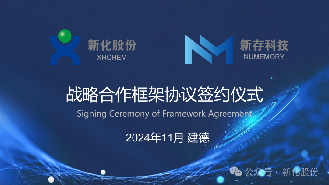 11月29日,浙江新化化工股份有限公司(简称“新化股份”)与新存科技(武汉)有限责任公司(简称“新存科技”)成功签署战略项目合作框架协议。新化股份党委书记胡健、董事长应思斌、新存科技董事长鞠韶复等出席签约仪式。