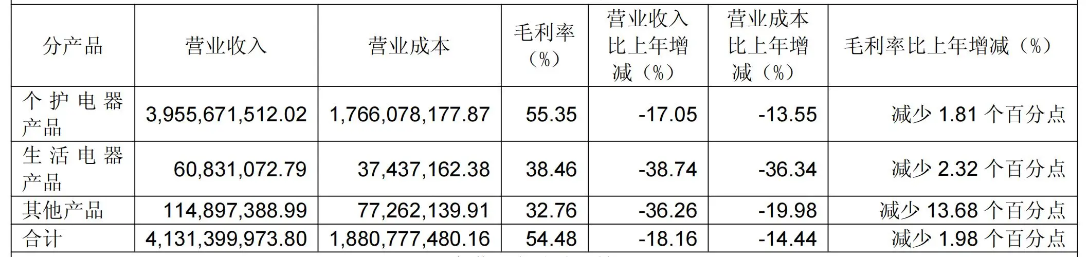 年报显示,分产品来看,不管是个护电器还是生活电器,其营收跟毛利率都出现不同程度的下滑。
