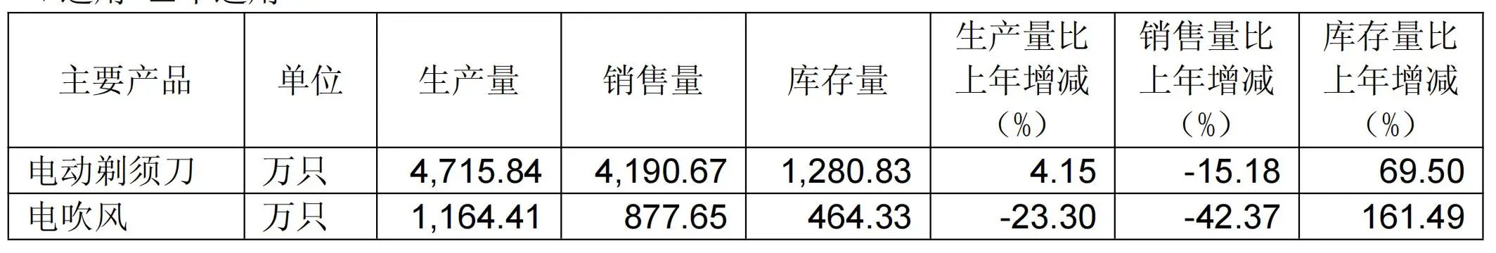 而对于电吹风本年度生产量大于销售量,库存量大增,飞科电器则称,主要系公司在本年度集中进行了电吹风产品结构调整。