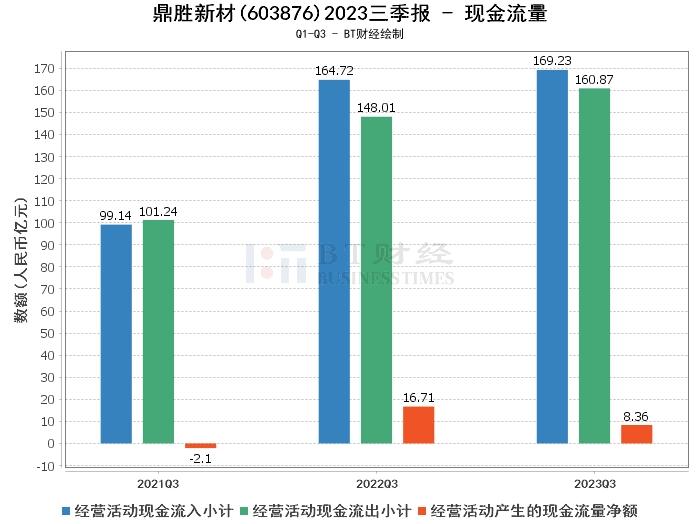 再次,从现金流量方面看,鼎胜新材2023年三季度的经营活动产生的现金流量净额为8.36亿元,相比上年同期的16.71亿元下降了49.98%。经营活动现金流入小计为169.23亿元,相比上年同期的164.72亿元有所增长。经营活动现金流出小计为160.87亿元,相比上年同期的148.01亿元有所增长。这些数据反映出公司在现金流量方面也面临一定的压力。