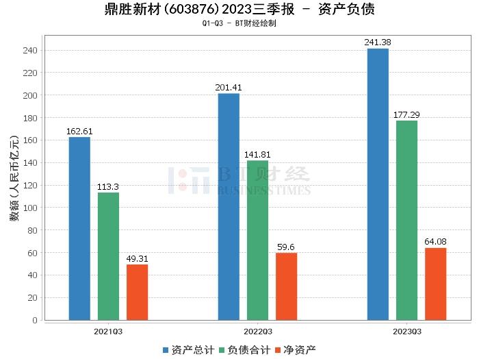 首先,从资产负债方面看,鼎胜新材2023年三季度的总资产为241.38亿元,相比上年度末的219.54亿元增长了9.95%。负债合计为177.29亿元,相比上年度末的156.38亿元增长了13.38%。净资产为64.08亿元,相比上年度末的63.16亿元略有增长,增长幅度为1.45%。资产负债率为73.45%,相比上年度末的71.23%有所上升。