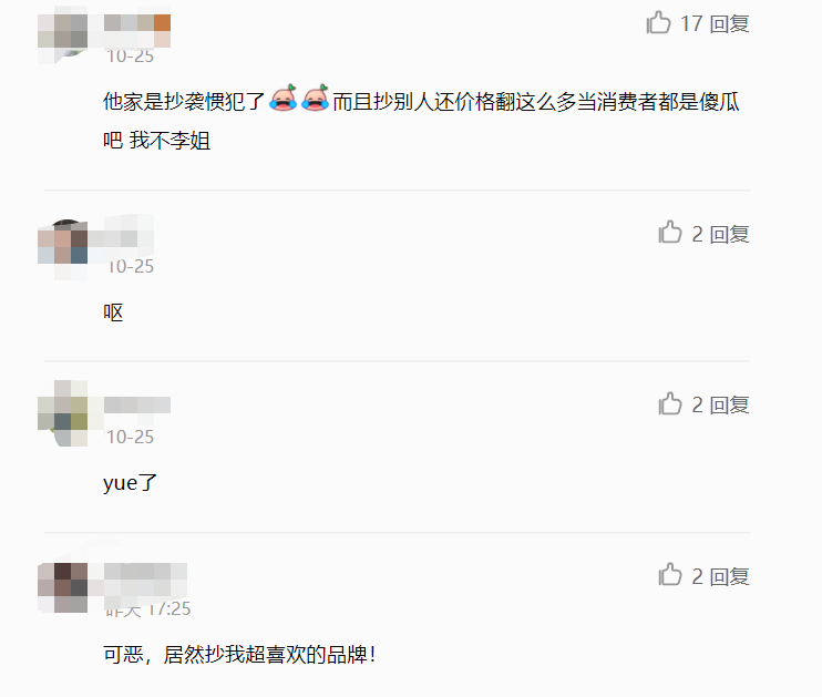 钱是赚到了,“转型出圈”也有了,但这靠着抄袭争议,从国内抄到国外,从一线设计师抄到小众品牌,靠抄袭出圈的品牌,这个国货之光,真的让人往脸上扇两耳光。