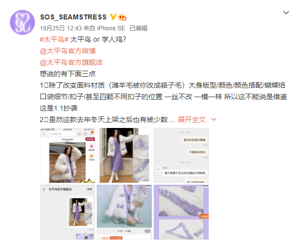 Ctrl+C和Ctrl+V,相信坐办公室的朋友再也熟悉不过了!太平鸟设计师更是深得其中的精髓。10月25日,原创设计小众服饰品牌SOS_SEAMSTRESS微博发文怒斥太平鸟抄袭,截图晒出自家设计服装和太平鸟“设计”服装撞车,除了材质不同,可以说是一毛一样。重点是,太平鸟的定价比SOS_SEAMSTRESS高出6倍左右!网友也调侃到:老抄袭玩家了。面对质疑,太平鸟官方选择了保持沉默。
