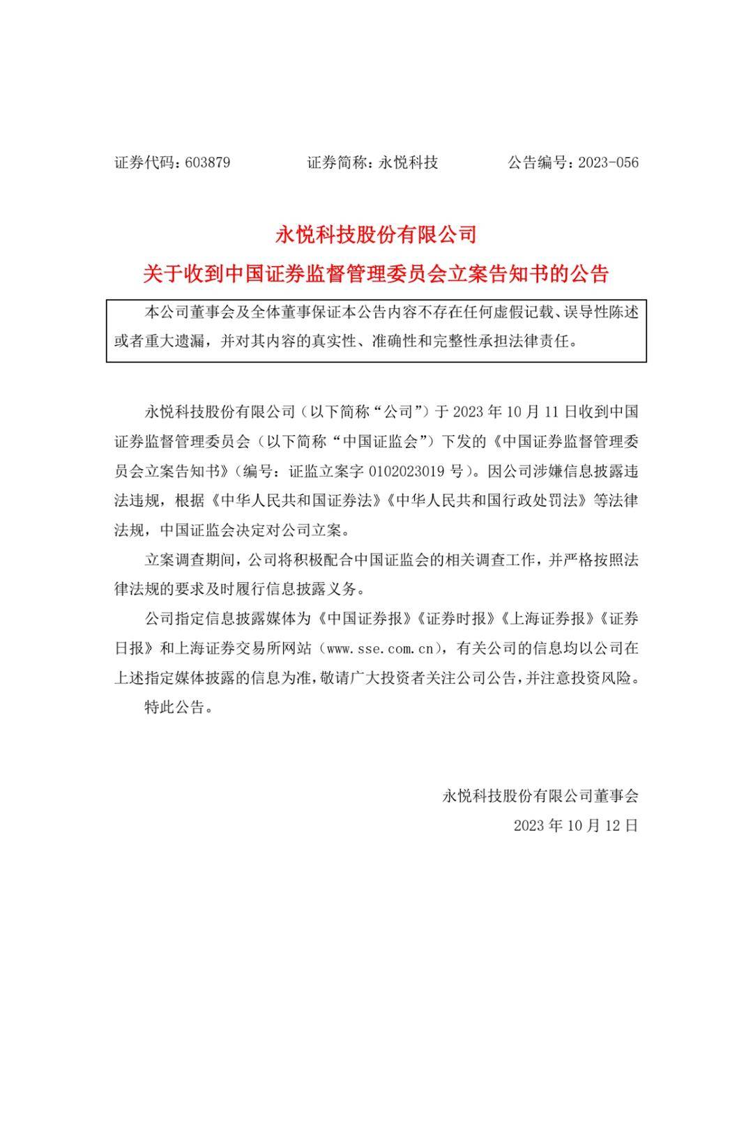 10月12日,永悦科技公告称,公司于10月11日收到证监会下发的《中国证券监督管理委员会立案告知书》。因公司涉嫌信息披露违法违规,证监会决定对公司立案。公司表示,立案调查期间,将积极配合中国证监会的相关调查工作,并严格按照法律法规的要求及时履行信息披露义务。受立案消息影响,永悦科技股价再次跌停。至于信批违法违规的原因,公告中并未提及。