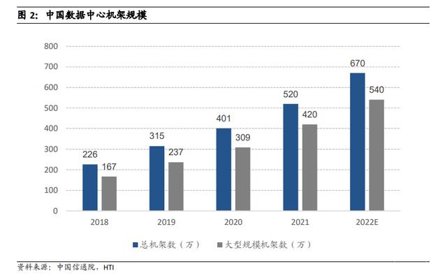 根据中国信通院的数据,我国数据中心机架规模持续稳步增长,大型以上数据中心规模增长迅速。按照标准机架 2.5kW 统计,我国数据中心机架数量在不断增加,2021 年达到 520 万架,近五年年均复合增速超过 30%,其中大型及超大型占比 80%。