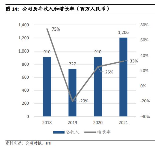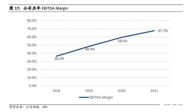 2018 到 2021 年,公司实现 EBITDA 分别为 3.32 亿,3.52 亿,5.41 亿和 8.16 亿元人民币,CAGR 达到 35%;2021 年同比增长 50.83%,明显高于公司收入的增速。公司 EBITDA 率分别为 36.5%,48.4%,59.5%,67.7%,持续快速提升,体现了公司运营效率和盈利能力的良好表现。