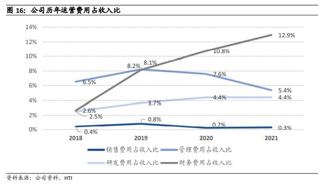 2018 到 2021 年,公司销售费用占收入比分别为 0.4%,0.8%,0.2%和 0.3%;管理费用占收入比分别为 6.5%,8.2%,7.6%和 5.4%;研发费用占收入比分别为 2.5%, 3.7%,4.4%和 4.4%;财务费用占收入比分别为 2.6%,8.1%,10.8%和 12.9%;