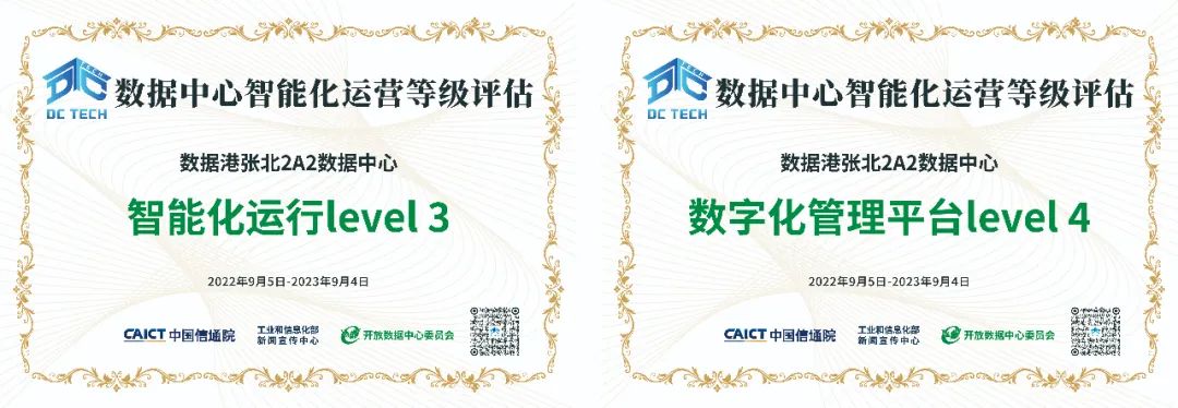 此次在DC-TECH数据中心智能化运营等级评估中,张北2A2数据中心获得“智能化运行LEVEL3”和“数字化管理平台LEVEL4”荣誉等级认证,正是业界对数据港智能化运营管理水平的高度认可与肯定。