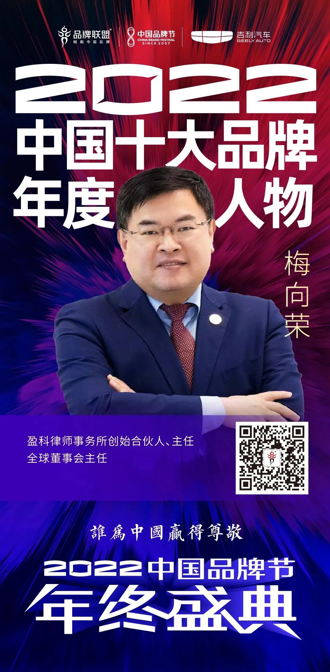 近日,由品牌联盟(Topbrand Union)主办的2022中国品牌节年终盛典在北京隆重举行。与会现场政、产、学、研、媒等各界大咖嘉宾荟萃,参会人数超过500人。本次盛典以“谁为中国赢得尊敬”为主题,公布了一系列重量级奖项。盈科律师事务所创始合伙人、主任、全球董事会主任,数据港独立董事、薪酬与考核委员会主任梅向荣先生作为具有全球视野的中国律师卓越代表,成功当选"2022中国十大品牌年度人物",同时入选的还有理想汽车创始人、董事长兼CEO李想,中国积极心理学发起人、清华大学社会科学学院院长彭凯平,中通快递集团董事长兼首席执行官赖梅松,文化学者、央视《百家讲坛》主讲人赵玉平,浙江省政协常委、奥康集团董事长王振滔等人。