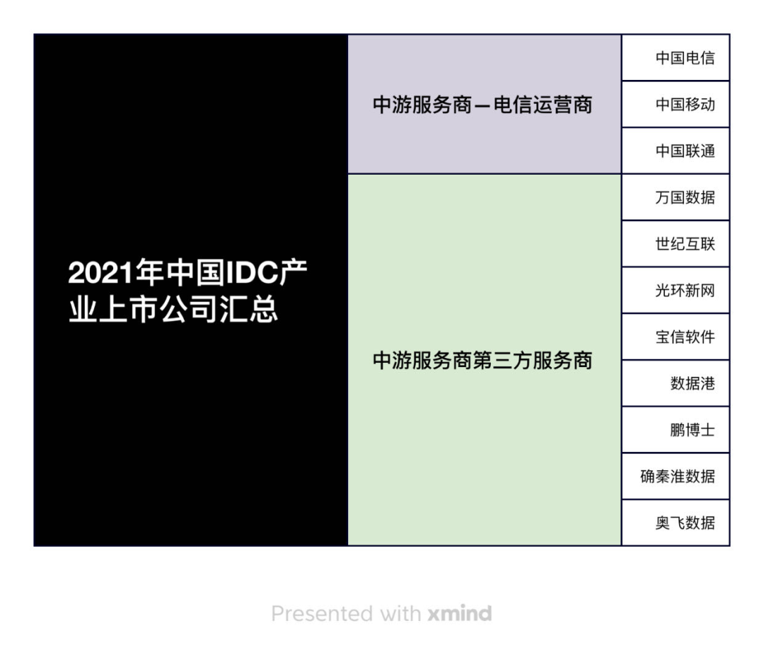 万国数据、世纪互联、光环新网、宝信软件、数据港、鹏博士(此公司已因虚假记载年报停牌)、秦淮数据(此公司已于23年退市,后续财报不再披露)、奥飞数据为中游服务商第三方服务商。2021年中国IDC上市公司业务布局如下。